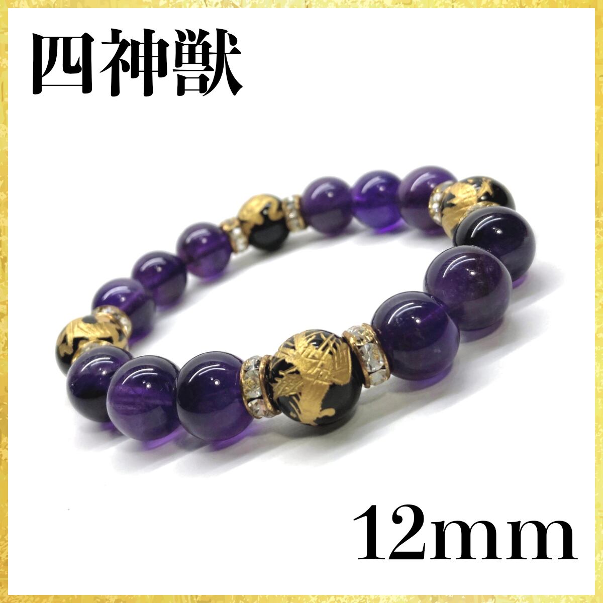 12mm 四神獣金彫オニキス×アメジスト パワーストーン ブレスレット天然石 運気上昇 開運 恋愛運 お守り 青龍 白虎 玄武 朱雀 2月誕生石GD