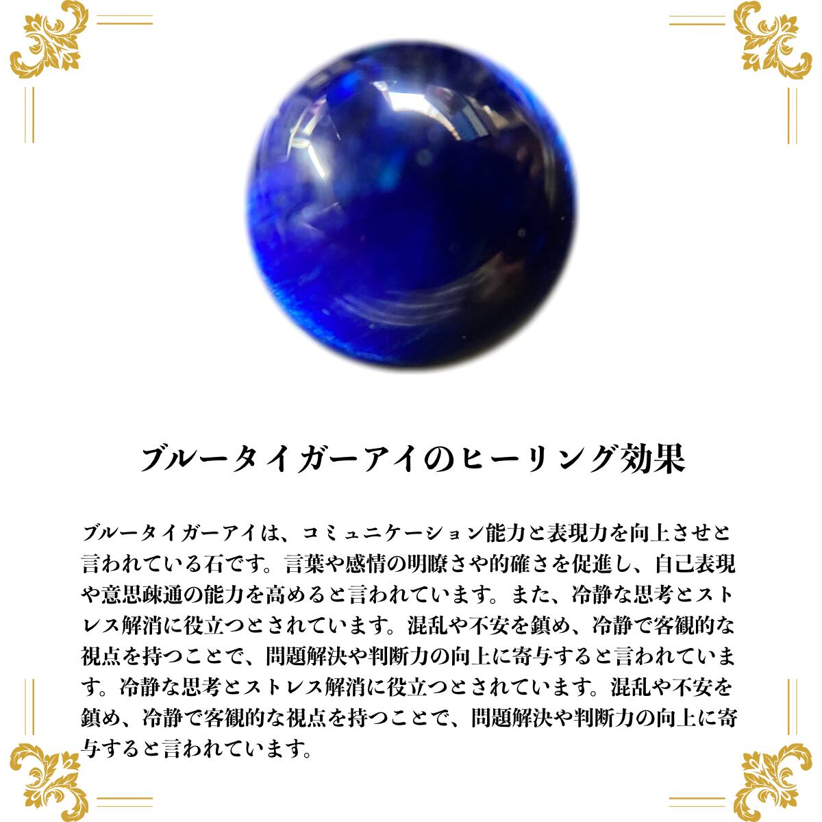 ブルータイガーアイは、コミュニケーション能力と表現力を向上させと言われている石です。言葉や感情の明瞭さや的確さを促進し、自己表現や意思疎通の能力を高めると言われています。また、冷静な思考とストレス解消に役立つとされています。混乱や不安を鎮め、冷静で客観的な視点を持つことで、問題解決や判断力の向上に寄与すると言われています。冷静な思考とストレス解消に役立つとされています。混乱や不安を鎮め、冷静で客観的な視点を持つことで、問題解決や判断力の向上に寄与すると言われています。