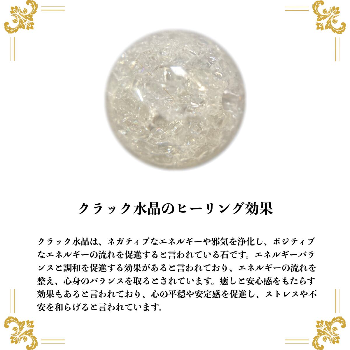 クラック水晶は、ネガティブなエネルギーや邪気を浄化し、ポジティブなエネルギーの流れを促進すると言われている石です。エネルギーバランスと調和を促進する効果があると言われており、エネルギーの流れを整え、心身のバランスを取るとされています。癒しと安心感をもたらす効果もあると言われており、心の平穏や安定感を促進し、ストレスや不安を和らげると言われています。