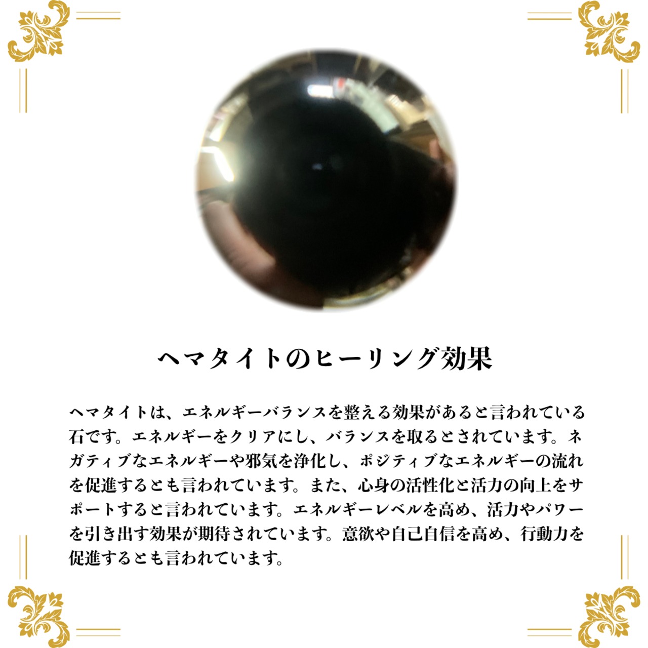 ヘマタイトは、エネルギーバランスを整える効果があると言われている石です。エネルギーをクリアにし、バランスを取るとされています。ネガティブなエネルギーや邪気を浄化し、ポジティブなエネルギーの流れを促進するとも言われています。また、心身の活性化と活力の向上をサポートすると言われています。エネルギーレベルを高め、活力やパワーを引き出す効果が期待されています。意欲や自己自信を高め、行動力を促進するとも言われています。