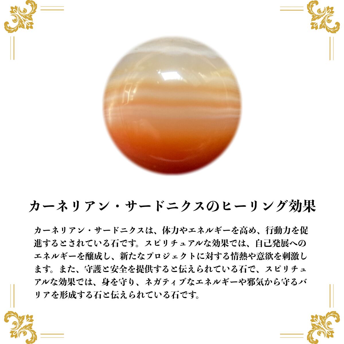 カーネリアン・サードニクスは、体力やエネルギーを高め、行動力を促進するとされている石です。スピリチュアルな効果では、自己発展へのエネルギーを醸成し、新たなプロジェクトに対する情熱や意欲を刺激します。また、守護と安全を提供すると伝えられている石で、スピリチュアルな効果では、身を守り、ネガティブなエネルギーや邪気から守るバリアを形成する石と伝えられている石です。