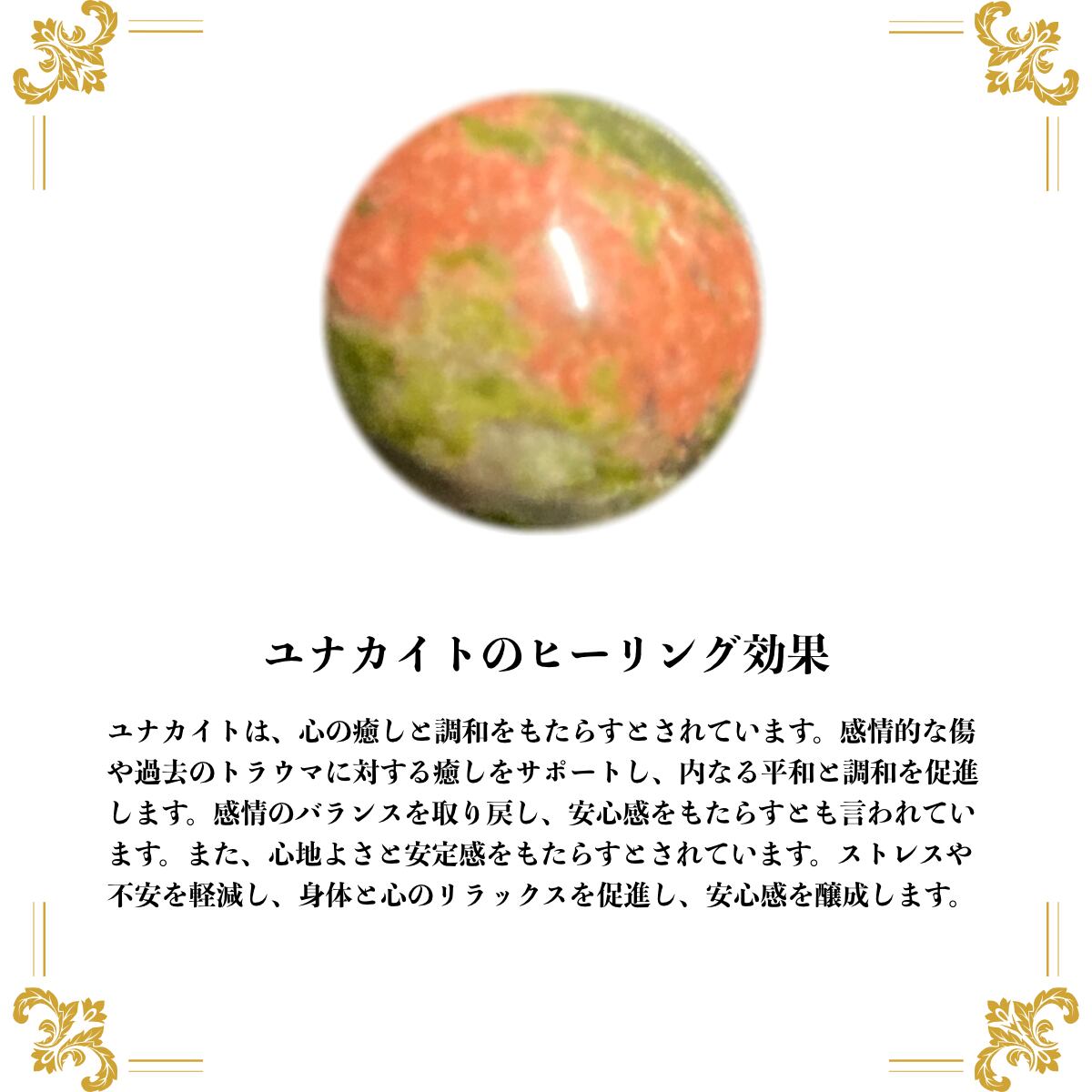 ユナカイトは、心の癒しと調和をもたらすとされています。感情的な傷や過去のトラウマに対する癒しをサポートし、内なる平和と調和を促進します。感情のバランスを取り戻し、安心感をもたらすとも言われています。また、心地よさと安定感をもたらすとされています。ストレスや不安を軽減し、身体と心のリラックスを促進し、安心感を醸成します。