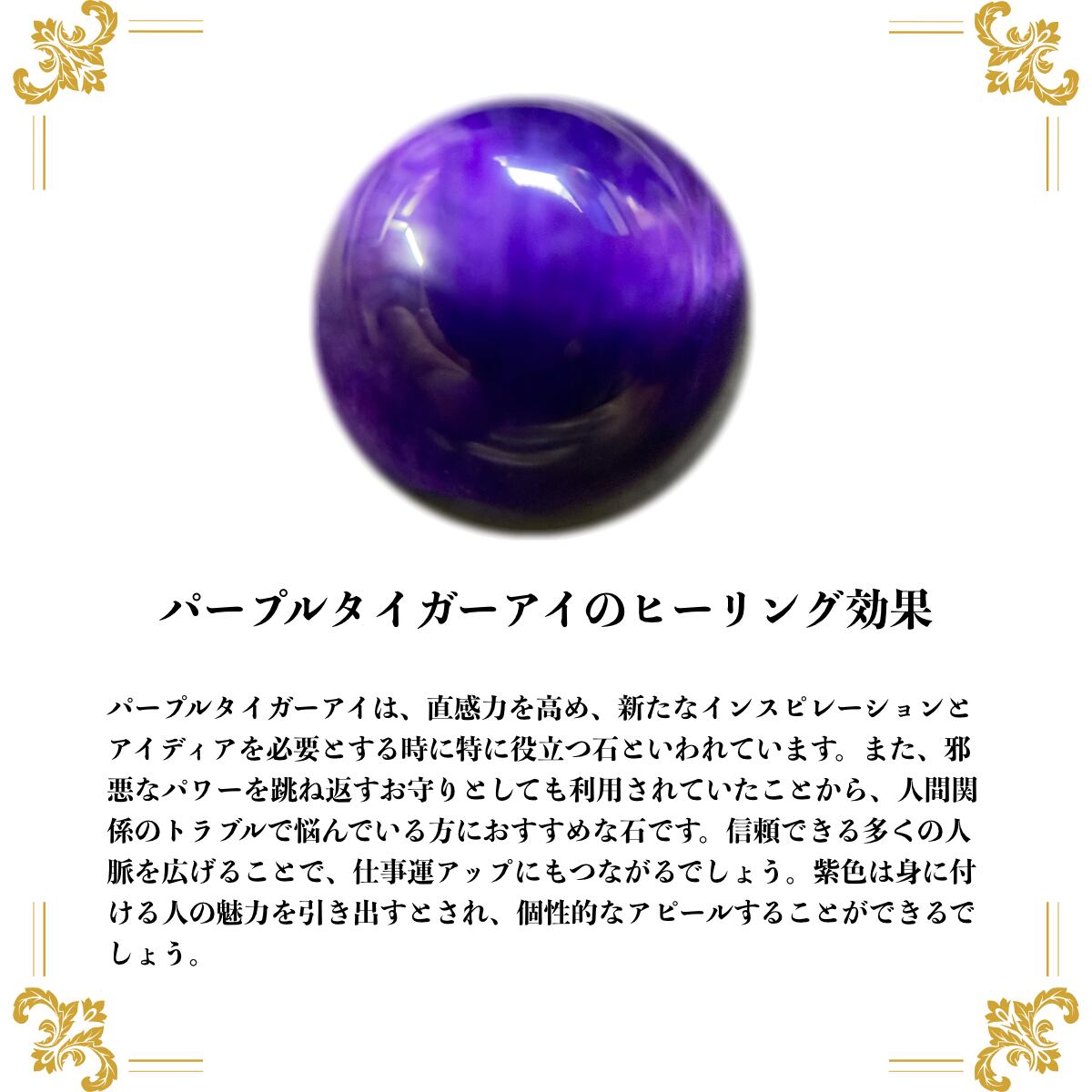 パープルタイガーアイは、直感力を高め、新たなインスピレーションとアイディアを必要とする時に特に役立つ石といわれています。また、邪悪なパワーを跳ね返すお守りとしても利用されていたことから、人間関係のトラブルで悩んでいる方におすすめな石です。信頼できる多くの人脈を広げることで、仕事運アップにもつながるでしょう。紫色は身に付ける人の魅力を引き出すとされ、個性的なアピールすることができるでしょう。
