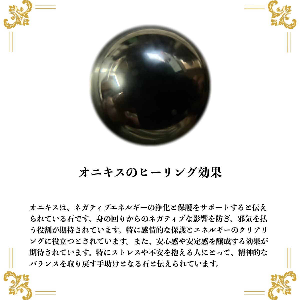 オニキスは、ネガティブエネルギーの浄化と保護をサポートすると伝えられている石です。身の回りからのネガティブな影響を防ぎ、邪気を払う役割が期待されています。特に感情的な保護とエネルギーのクリアリングに役立つとされています。また、安心感や安定感を醸成する効果が期待されています。特にストレスや不安を抱える人にとって、精神的なバランスを取り戻す手助けとなる石と伝えられています。