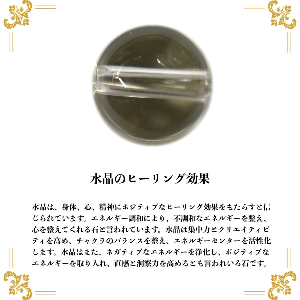 水晶は、身体、心、精神にポジティブなヒーリング効果をもたらすと信じられています。エネルギー調和により、不調和なエネルギーを整え、心を整えてくれる石と言われています。水晶は集中力とクリエイティビティを高め、チャクラのバランスを整え、エネルギーセンターを活性化します。水晶はまた、ネガティブなエネルギーを浄化し、ポジティブなエネルギーを取り入れ、直感と洞察力を高めるとも言われいる石です。